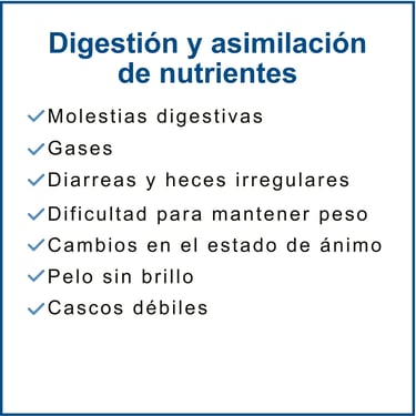 El intestino del caballo es un ecosistema complejo, más del 70 % del sistema inmunitario del caballo reside en su intestino, y es allí donde se define su energía, vitalidad y rendimiento. En su microbiota millones de bacterias beneficiosas fermentan la fibra y allí es donde se produce gran parte de su energía y vitalidad. Cuando este equilibrio se altera por dietas incorrectas, mal absorción de nutrientes, estrés o medicamentos, aparecen problemas digestivos como : cólicos, acidosis, laminitis, pérdida de masa muscular, pérdida de peso crónico, desequilibrios inmunológicos o cambios de temperamento.